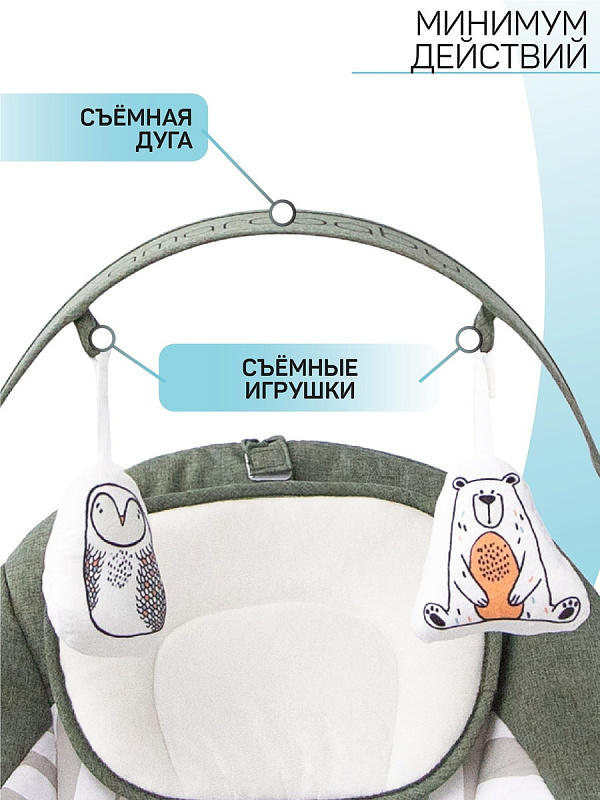 - Дуга с игрушками снимается, при этом можно зафиксировать сиденье-гамак в одном положении и покормить ребенка, используя качели как стульчик для кормления
