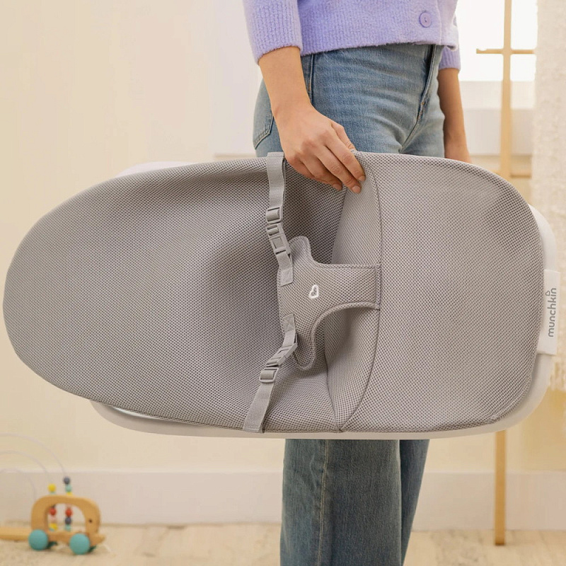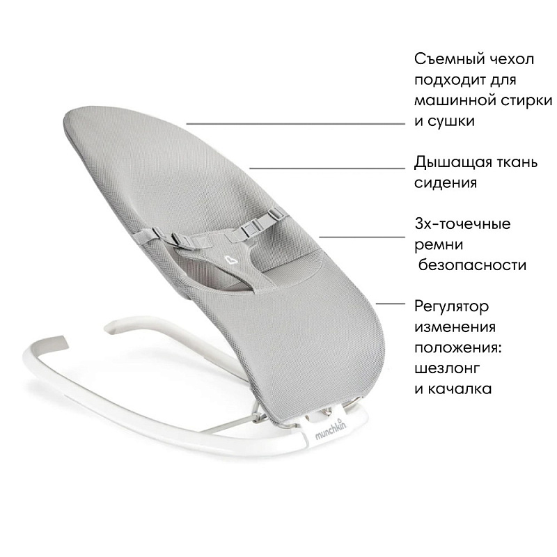 Шезлонг-качалка Munchkin имеет 3 положения наклона спинки, чтобы малышу было комфортно на каждом этапе роста и развития. Отдыхать, дремать, наблюдать за мамой и просто весело проводить время, покачиваясь в естественном ритме.