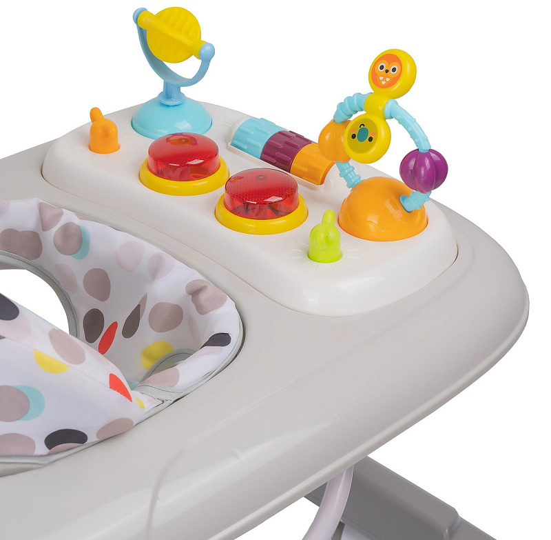 Музыкальная игровая панель со световыми эффектами и 12 мелодиями превращает ходунки в полноценную развивающую зону. Большой набор интерактивных элементов стимулирует интерес ребенка и способствует развитию моторики. Панель съемная, что упрощает уход и расширяет варианты использования модели.