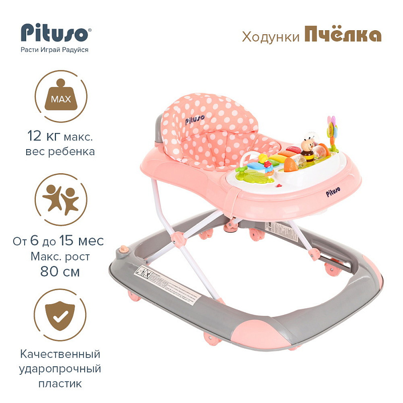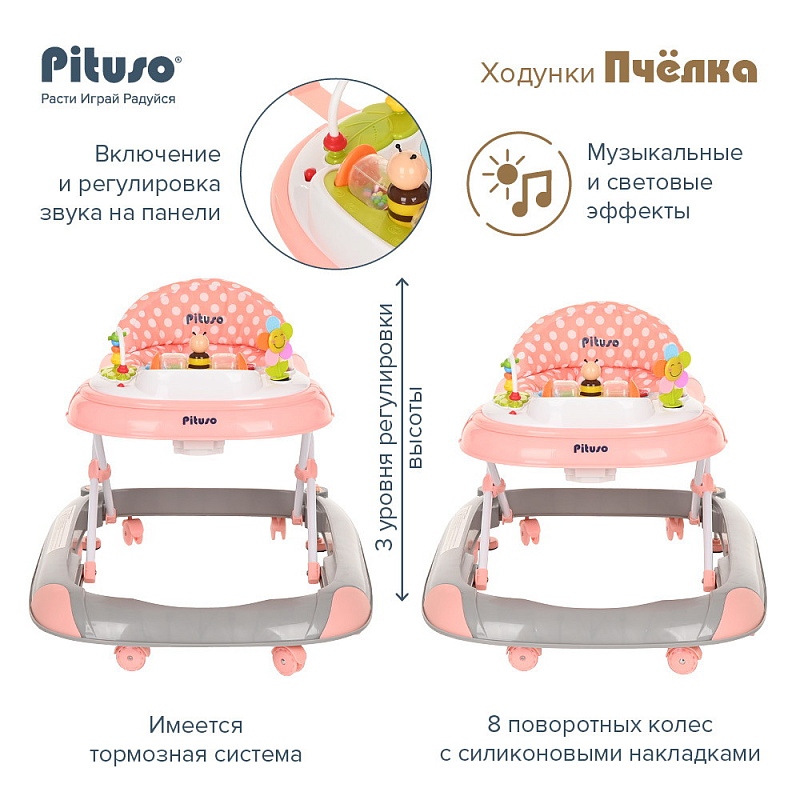 Ходунки PITUSO Пчёлка – отличный помощник для подготовки малыша к первым самостоятельным шагам, развивают координацию движений и помогают ребенку научиться держать равновесие. Ходунки легко регулируются в зависимости от роста ребенка, что способствует правильной постановке стопы при передвижении. Эргономичная форма сидения с поддержкой спины обеспечит правильную посадку ребенка. Съемная музыкальная панель с игрушками способствует развитию у малыша мелкой моторики, можно использовать отдельно от ходунков.