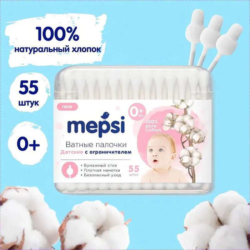 Детские ватные палочки Mepsi с ограничителем, 55 шт