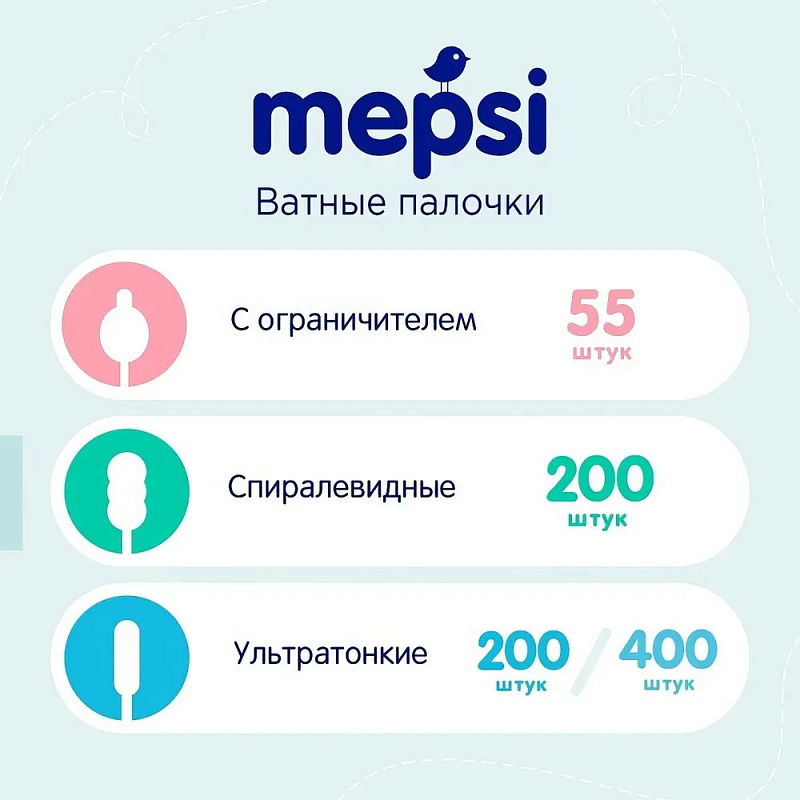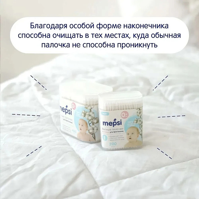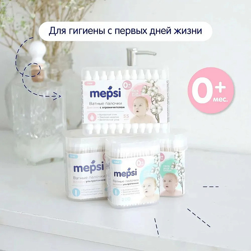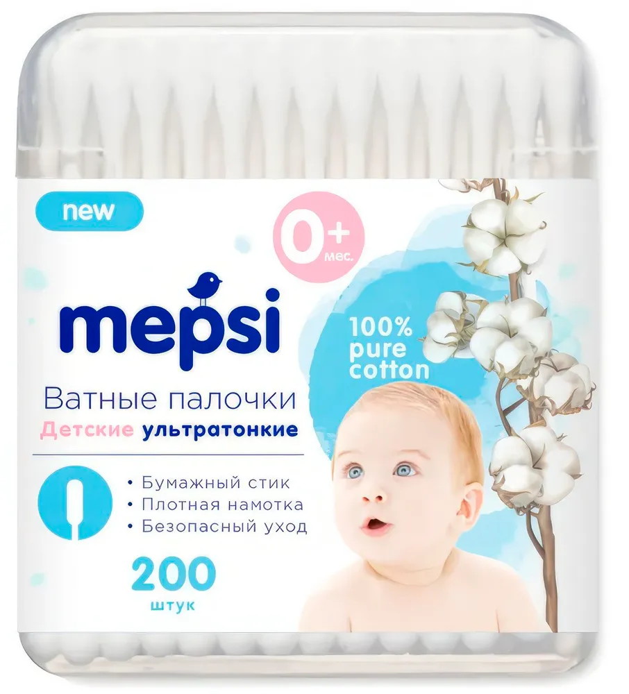 Детские ватные палочки Mepsi ультратонкие, 200 шт