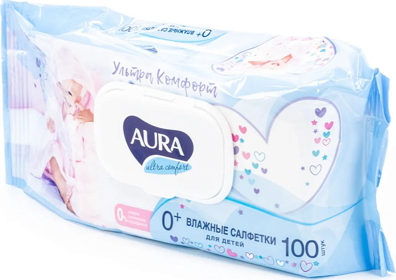 Детские влажные салфетки Aura Ultra Comfort с крышкой 100 шт.