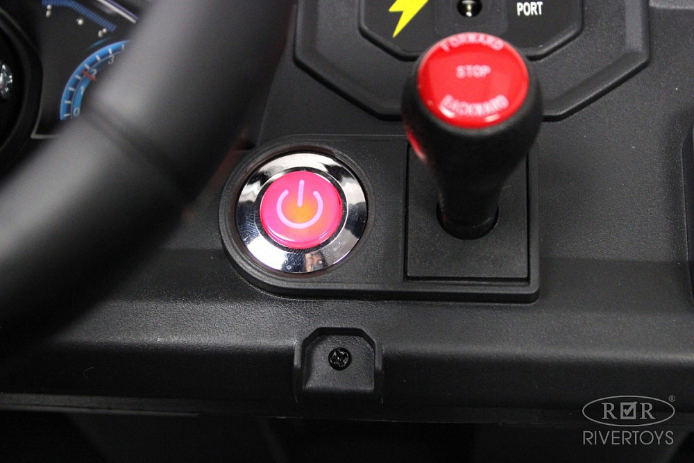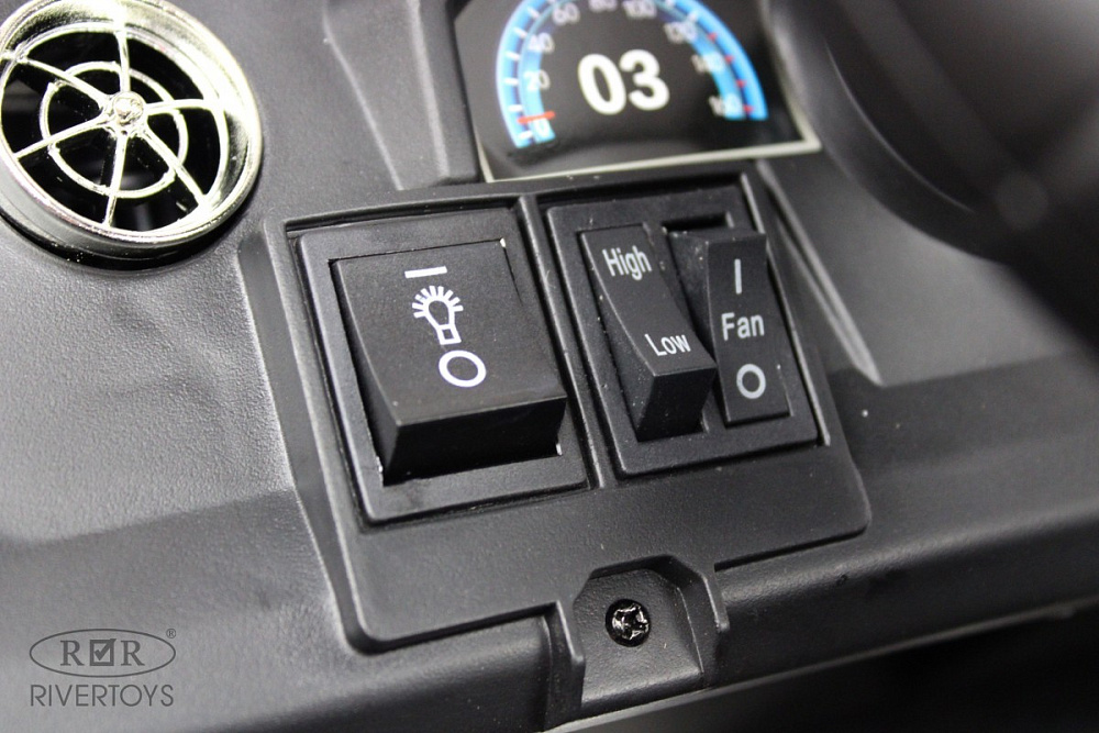 Включение электромобиля осуществляется с помощью кнопки, а кнопка переключения между пультом и педалями добавляет удобства в использовании. Кондиционер, который включается отдельной кнопкой, сделает поездку максимально комфортной.