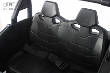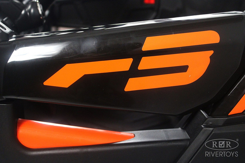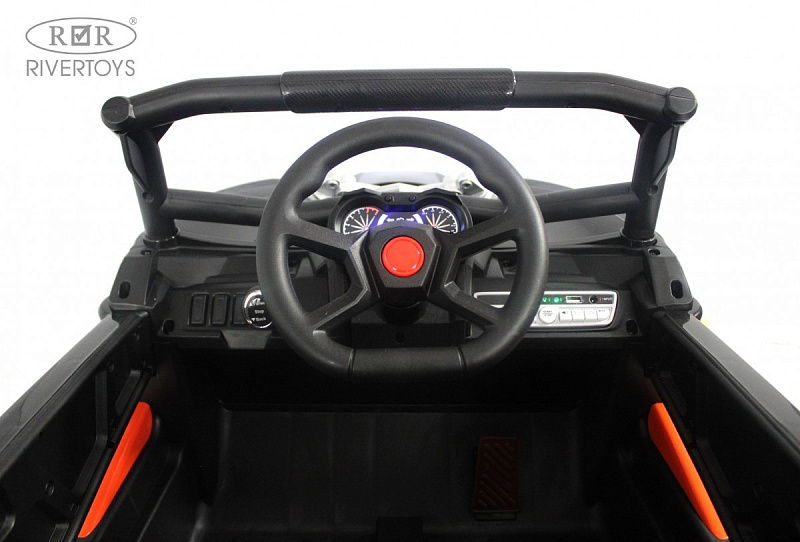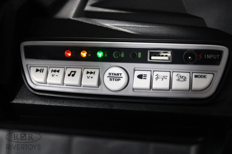 Для безопасности ребёнка предусмотрен полосной ремень безопасности, а амортизаторы обеспечивают комфорт во время катания. Медиа-панель оснащена USB-входом, AUX, Bluetooth и индикатором заряда батареи.