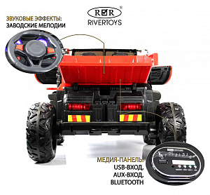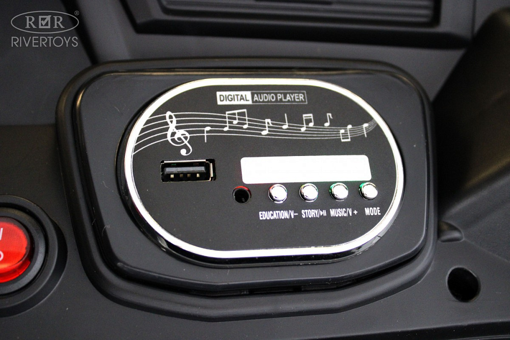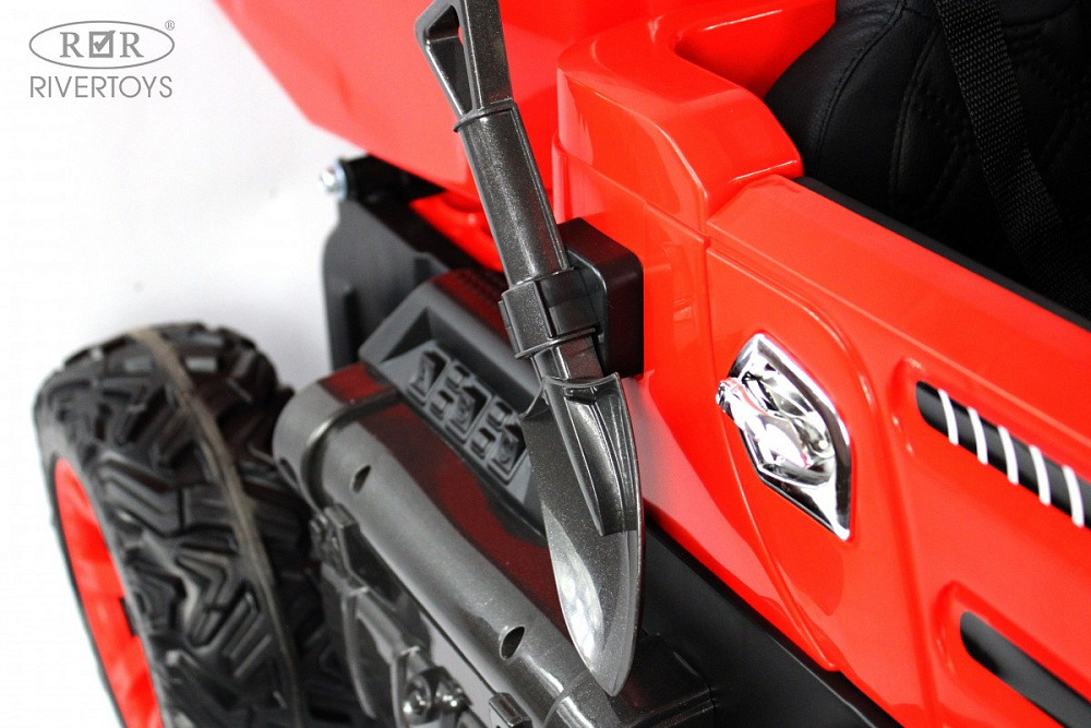 Кузов автомобиля управляется электронным рычагом, позволяя поднимать и опускать его по необходимости. Комплект поставки включает в себя лопату, чтобы ребенок мог играть в песочнице. Медиа-панель электромобиля оснащена USB-входом и AUX-входом, что позволяет вашему ребенку слушать любимую музыку во время езды. Индикатор заряда батареи помогает контролировать уровень заряда.