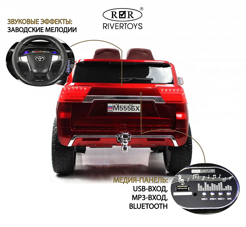 RiverToys Toyota Land Cruiser М555BH – лицензионный детский электромобиль, оснащенной дистанционным управлением и полным приводом, с которым ваш ребенок будет готов активно исследовать мир.