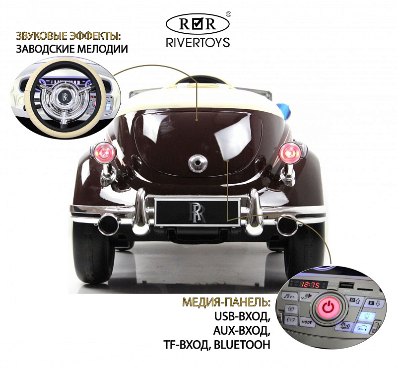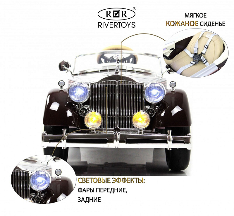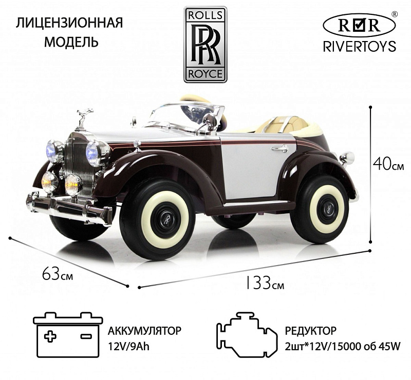 Rolls-Royce E444EE с дистанционным - уникальный ретро электромобиль в своем классе. Фантастический дизайн 50х-60х годов покорит любого автолюбителя даже с самым изысканным вкусом. Абсолютно реалистичный дизайн и невероятные расцветки кузова модели приведут Вас и Вашего малыша в полный восторг. Электромобиль оснащен комфортным салоном с сиденьем из Эко кожи и ремнем безопасности. В модели установлено очень много освещения, подсветка дверей, фары и панель, так же исключительной особенностью Rolls-Royce (E444EE) являются встроенные поворотники. Малыш может сам включать поворотные огни и соблюдать все правила движения). Из дополнительных особенностей салона модель имеет открывающийся задний багажник и фирменные коврики в салон.