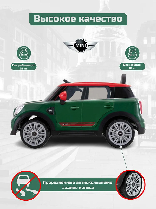 Мощный 12V MINI Countryman повезет детей от трех до шести лет в большое и интересное приключение. Аутентичный дизайн отражается во многих деталях, легко открывающаяся дверь, светящаяся приборная панель, мягкое сиденье, мягкие резиновые шины, световые и звуковые эффекты.