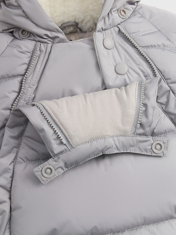 Несъемный капюшон защищает малыша от сильного ветра на прогулке, а подкладка из мягкого флиса с ворсом обеспечивает тепло и комфорт. Подкладка комбинезона выполнена из мягкого гипоаллергенного 100% хлопка.