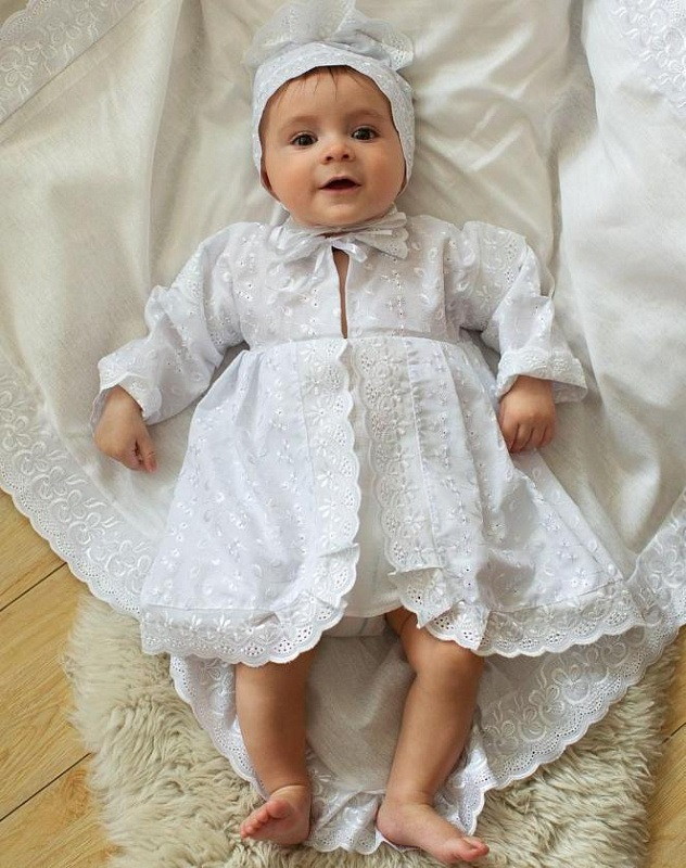 Для крещения ребенку нужна новая крестильная одежда, которую родители хранят как память о таинстве. Платье свободного кроя, без застежек и завязок, что позволит быстро одеть малыша. Чепчик с рюшами, на завязках. Торжественности модели придает вставка из рюш. Крещение - это таинство, которое дает невидимую защиту и заботу малышу. Совсем маленькие дети гораздо спокойнее ведут себя на крещении и не пугаются, когда их на руки берет кто-то чужой (крестные или священник).