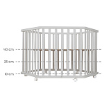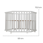 Большой шестиугольный деревянный манеж оснащен текстильной бампером с мягким дном и бортами для безопасности ребенка.