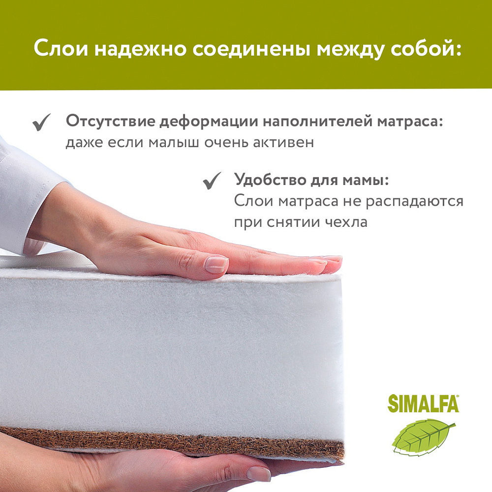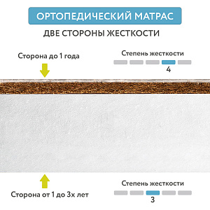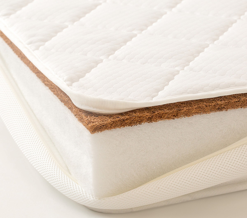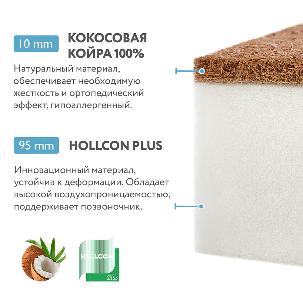 Недорогой ортопедический беспружинный матрас из экологически чистых материалов с разной жесткостью сторон. Основа матраса – плита из гипоаллергенного, прекрасно сохраняющего форму материала - Hollcon Plus. В качестве настилочного материала с одной из сторон – кокосовая койра, придающая матрасу жесткость. Оба наполнителя – холлкон и латексированная кокосовая койра – не впитывают запахи, не вызывают аллергии, отлично вентилируются. Съемный чехол на молнии с 3D-сеткой по периметру выполнен из стеганого трикотажа - приятной и бархатистой на ощупь ткани. Модель рекомендуется детям от 0 до 3 лет.