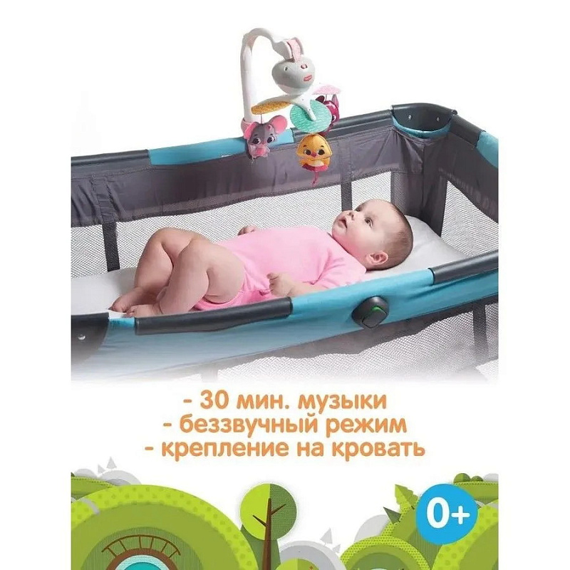 - Разные виды крепления: дуга на кроватку, "краб" и липучка для крепления на коляску и автомобильное кресло;