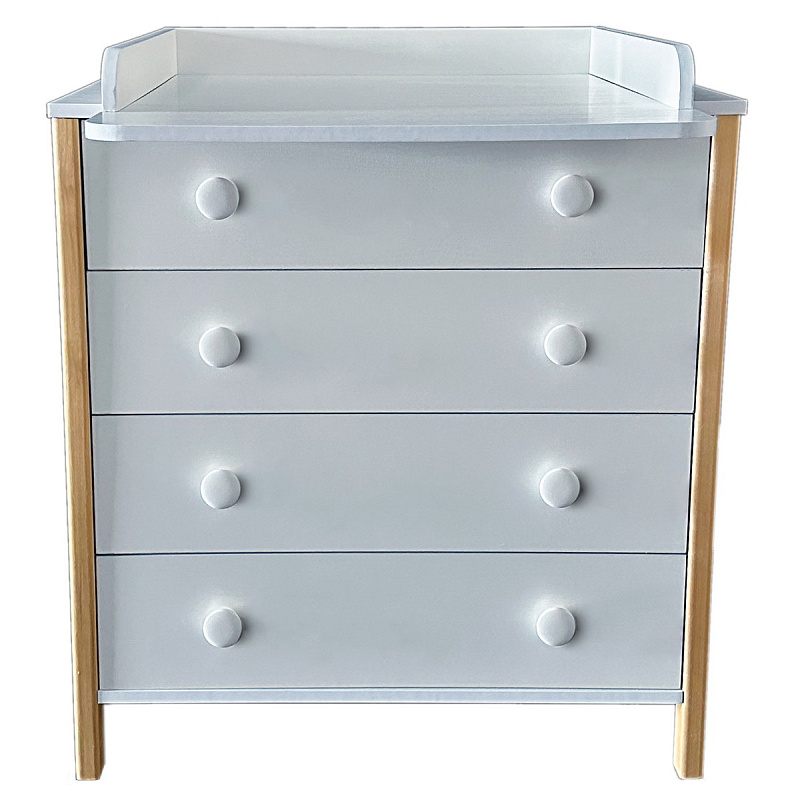Комод SOLNYSHKO 800/4 от производителя Антел представлен в трех стильных цветовых решениях: белый с отделкой цвета бук, белый с серыми вставками по бокам и чисто белый вариант. Этот комод отличается компактностью и вместительностью, идеально подходит для хранения детских вещей и игрушек.