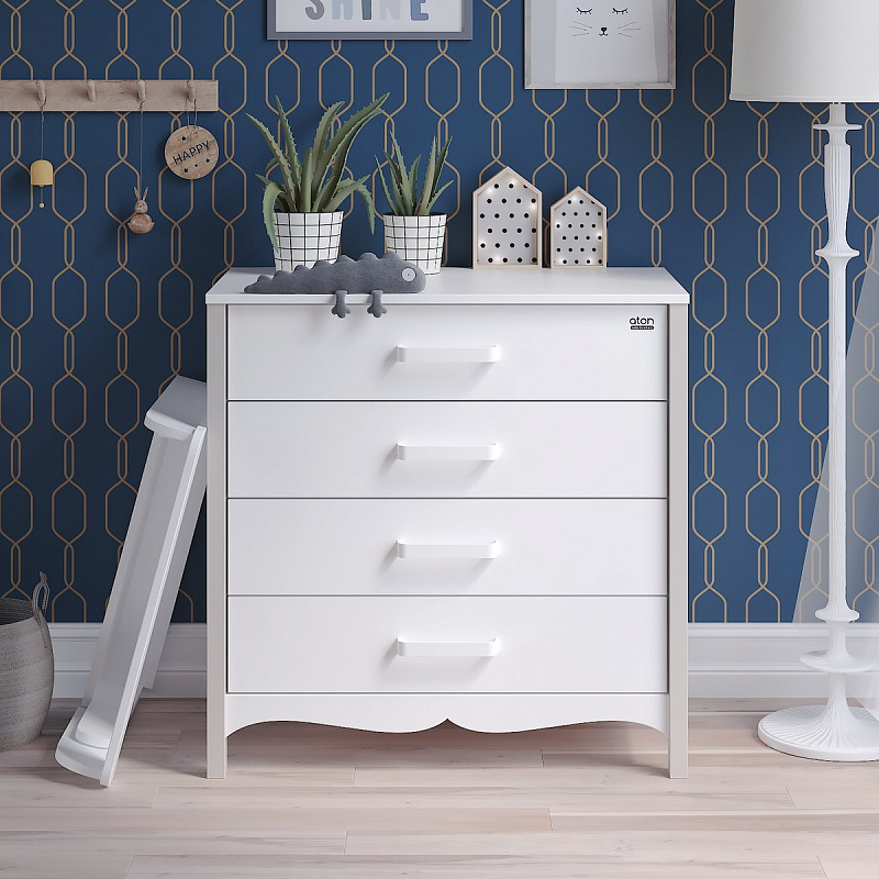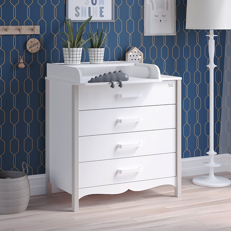 Практичный и стильный детский комод FELIX оборудован полкой, которую можно быстро и легко переоборудовать в комфортабельный столик для пеленания. Модель оснащена четырьмя вместительными ящиками на шариковых направляющих бесшумного плавного хода. Также стоит отметить особенности дизайна: красивые деревянные ножки, корпус из ЛДСП, фасады из МДФ , современные металлические ручки со скругленными углами.