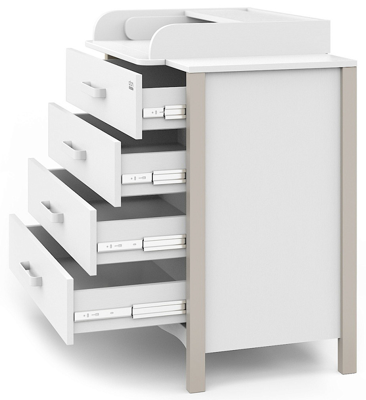 Пеленальный столик можно установить слева, справа или по центру, он легко снимается, не оставляя никаких следов на столешнице, а в сложенном состоянии может использоваться в качестве дополнительной открытой полочки (например, для памперсов и пеленок). Для новорожденного ребенка на комод установлены специальные бортики, полностью исключающие вероятность выпадения малыша во время пеленания или массажа.