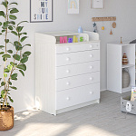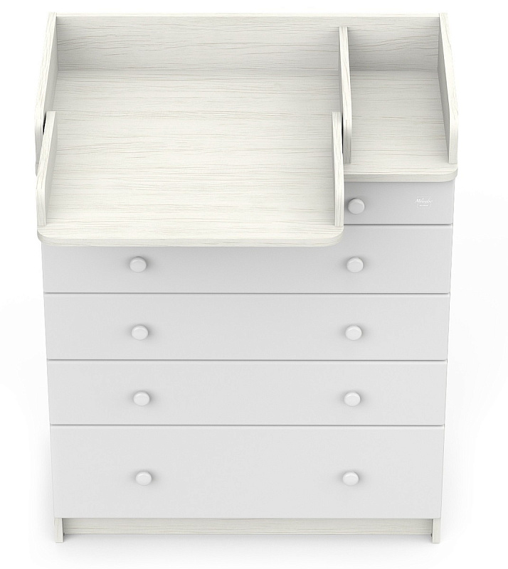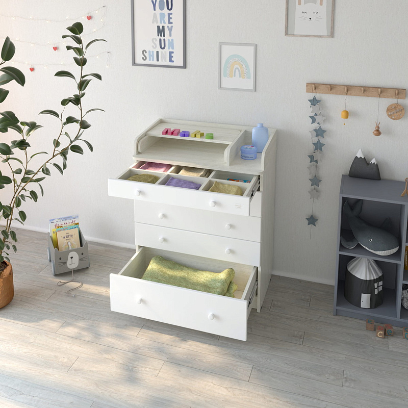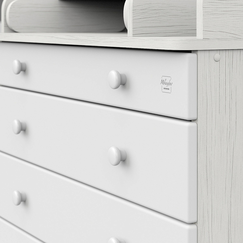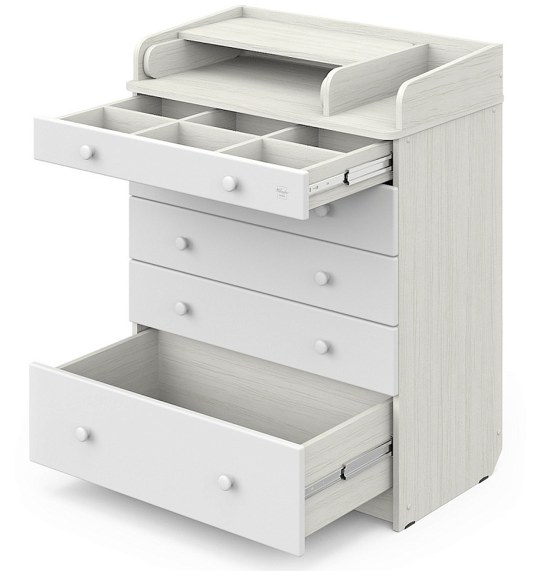 Элегантный, выполненный в современном стиле и удобный пеленальный комод, в комбинациях контрастных оттенков благородной древесины с нежными, приятными на ощупь, белыми или бежевыми фасадами. В комоде используется пеленальный столик с простым и надежным, скрытым механизмом раскладывания. Есть отделение рядом с пеленальным столиком для средств по уходу за малышом в быстром доступе. Комод очень вместительный благодаря пяти ящикам, которые установлены на надежные шариковые направляющие бесшумного хода. Нижний ящик большей глубины, а верхний с органайзером для удобства сортировки детских вещей (6 отделений).