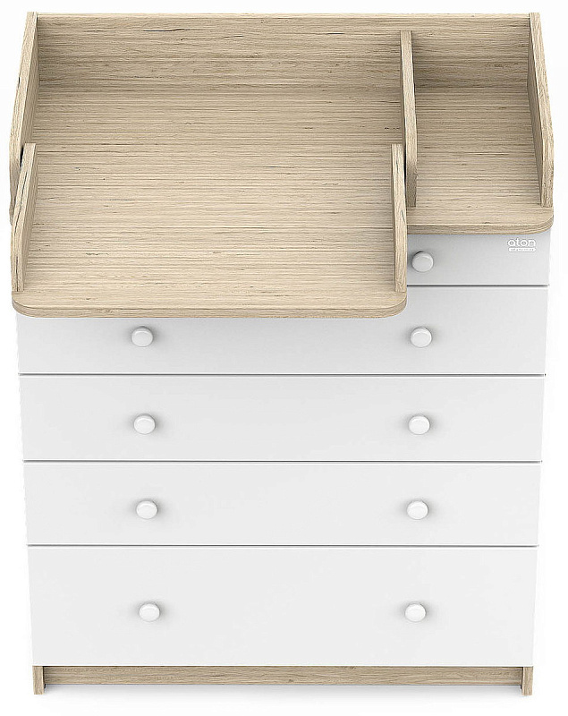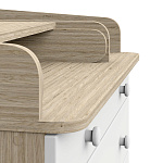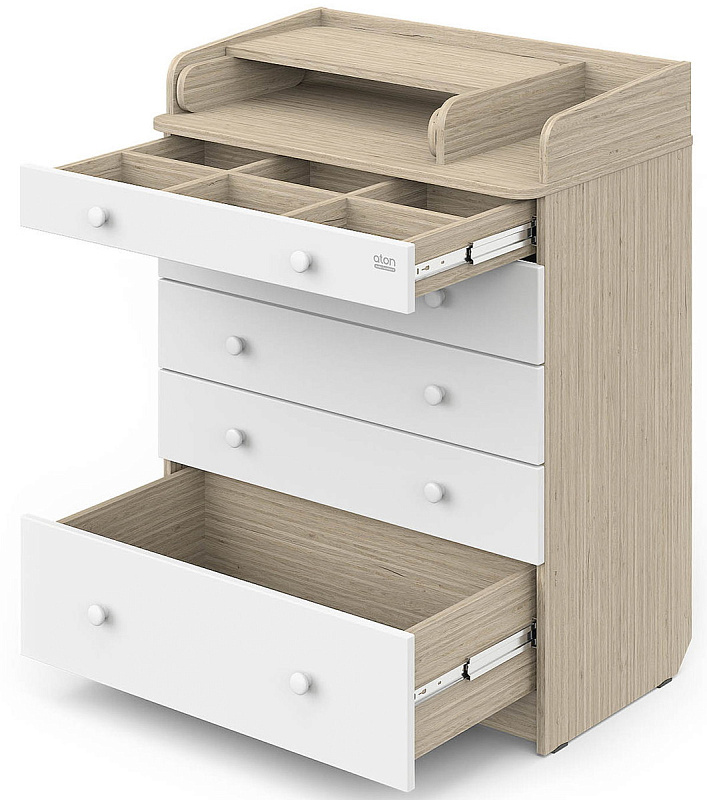 Элегантный, выполненный в современном стиле и удобный пеленальный комод, в комбинациях контрастных оттенков благородной древесины с нежными, приятными на ощупь, белыми или бежевыми фасадами. В комоде используется пеленальный столик с простым и надежным, скрытым механизмом раскладывания. Есть отделение рядом с пеленальным столиком для средств по уходу за малышом в быстром доступе. Комод очень вместительный благодаря пяти ящикам, которые установлены на надежные шариковые направляющие бесшумного хода. Нижний ящик большей глубины, а верхний с органайзером для удобства сортировки детских вещей (6 отделений).