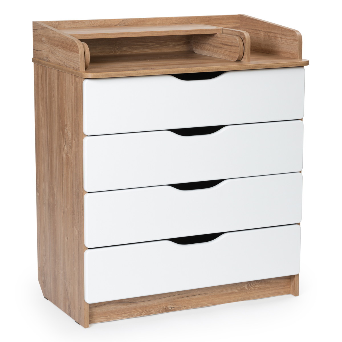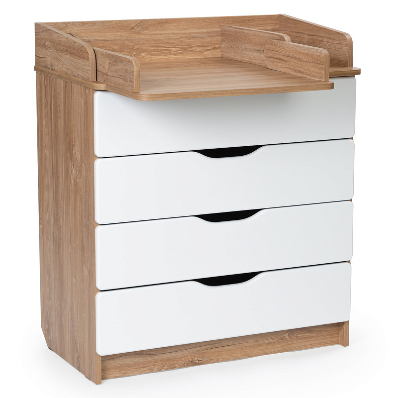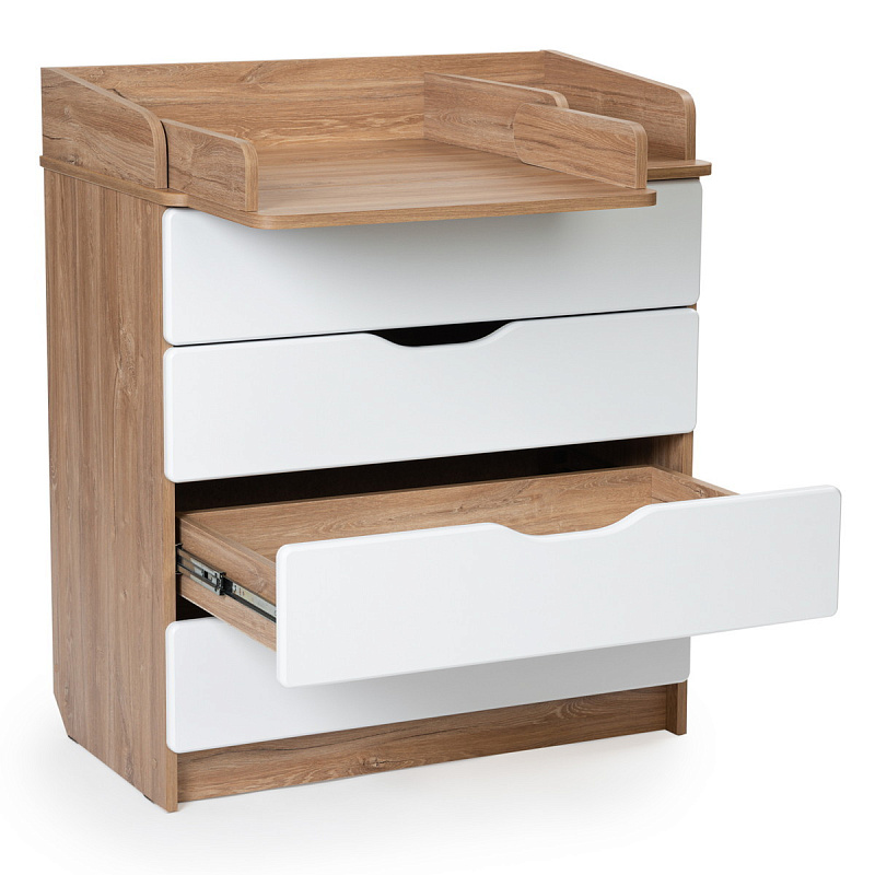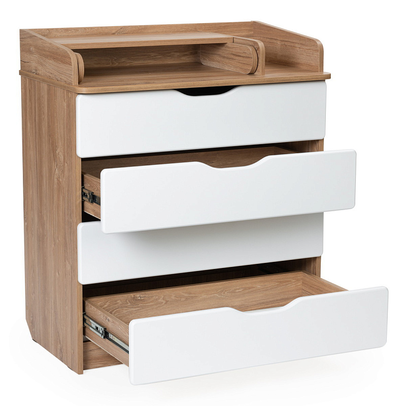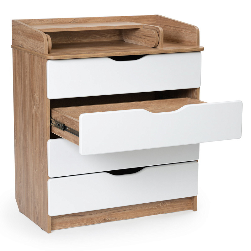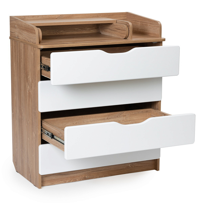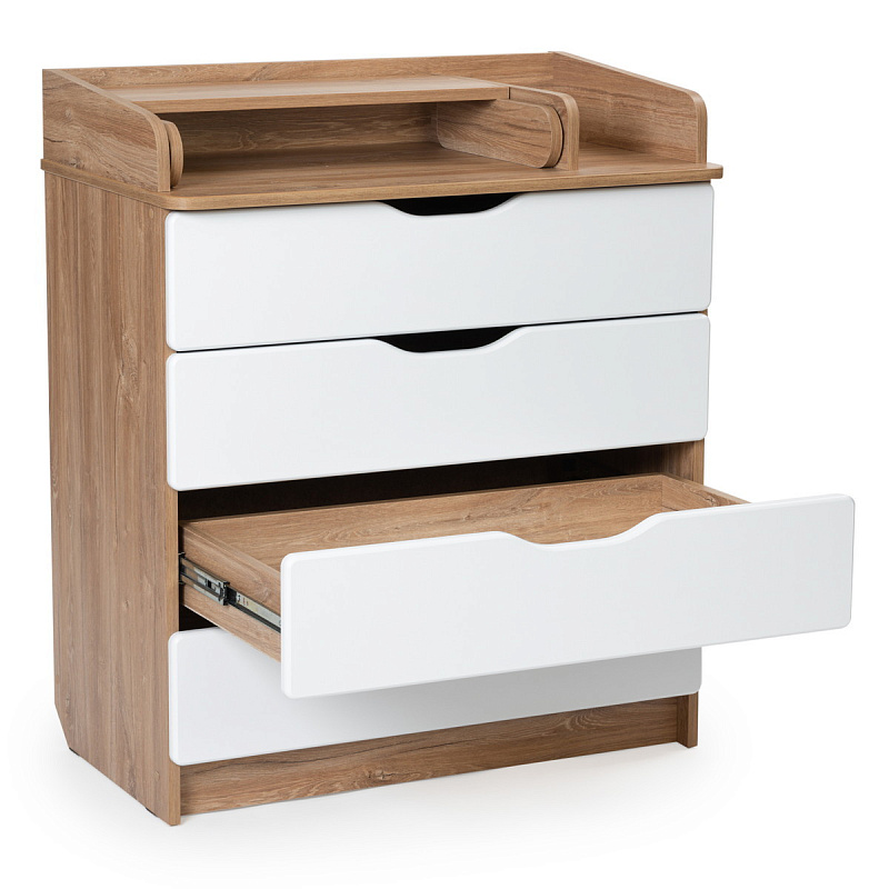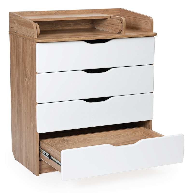 помощник становится детский комод Bebizaro. Комод можно разместить в любом удобном месте. Это незаменимый предмет в доме, выступающий не только в роли шкафа для детских вещей, но и как пеленальный столик и место для переодевания ребёнка. Удобный и практичный комод с 4-я ящиками позволит значительно сэкономить пространство и разместить все необходимое для вашего ребёнка, детские вещи, подгузники, средство для гигиены. Комод оборудован пеленальным столиком с простым и надежным механизмом раскладывания, 4-е вместительных ящика.