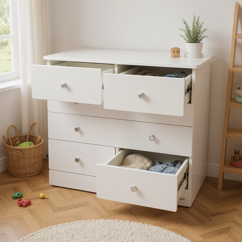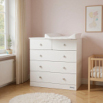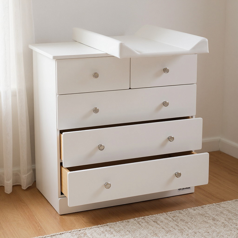 Практичность и удобство: просторные ящики для хранения детских вещей, а съемная пеленальная доска позволяет использовать комод долгие годы.