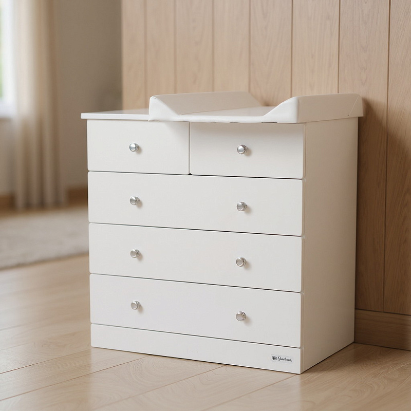 Этот практичный и элегантный комод станет верным помощником для родителей, а его универсальный лаконичный дизайн органично впишется в любой интерьер – от классического до современного. В комплекте – мягкая накладная пеленальная доска для комфортного ухода за малышом, которая обеспечит удобство во время смены подгузников и ухода за малышом.