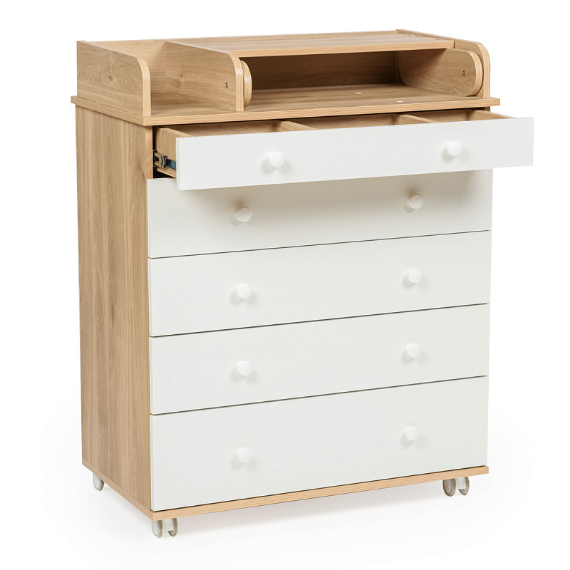 Нельзя не отметить безопасность этого комода – его закруглённые углы полностью соответствуют требованиям безопасности для малыша. И, что также важно, в дальнейшем пеленальный столик можно использовать как дополнительную полочку под аксессуары или полностью демонтировать, продолжив пользоваться комодом в его классическом стиле. Дополнительным плюсом являются прорезиненные колёса, которые позволяют удобно перемещать комод во время уборки комнаты.