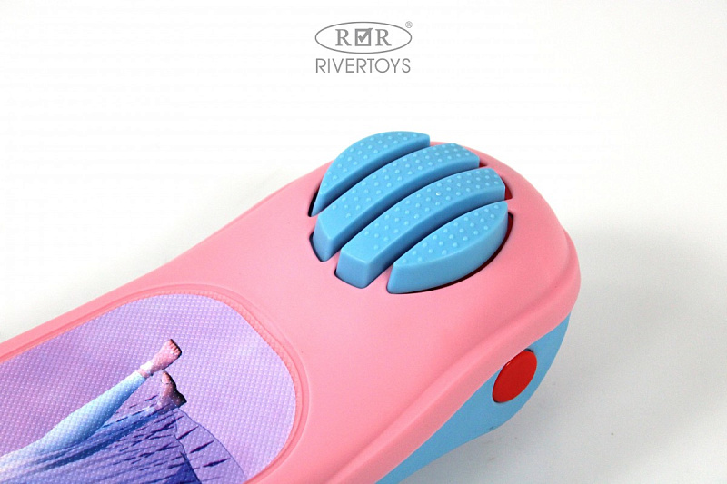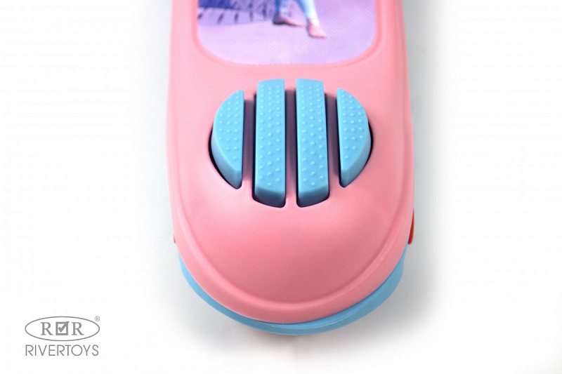 Полипропиленовая дека обеспечивает надёжность и устойчивость, а задний тормоз гарантирует безопасность во время катания. Три колеса диаметром 115 мм спереди делают самокат устойчивым и манёвренным.