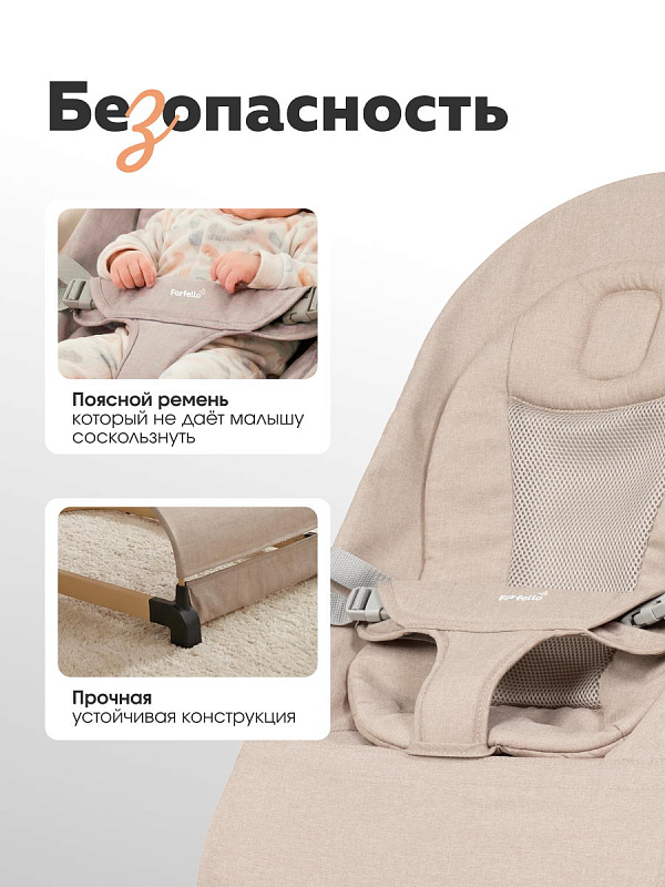 Шезлонг Farfello Q1 — это удобное и надёжное пространство, созданное для самых маленьких. Мягкое покачивание имитирует нежные движения на руках у мамы, помогая быстро успокоиться, расслабиться и заснуть. А когда малыш активничает — он сам приводит шезлонг в движение, развивая чувство равновесия и координацию движений.