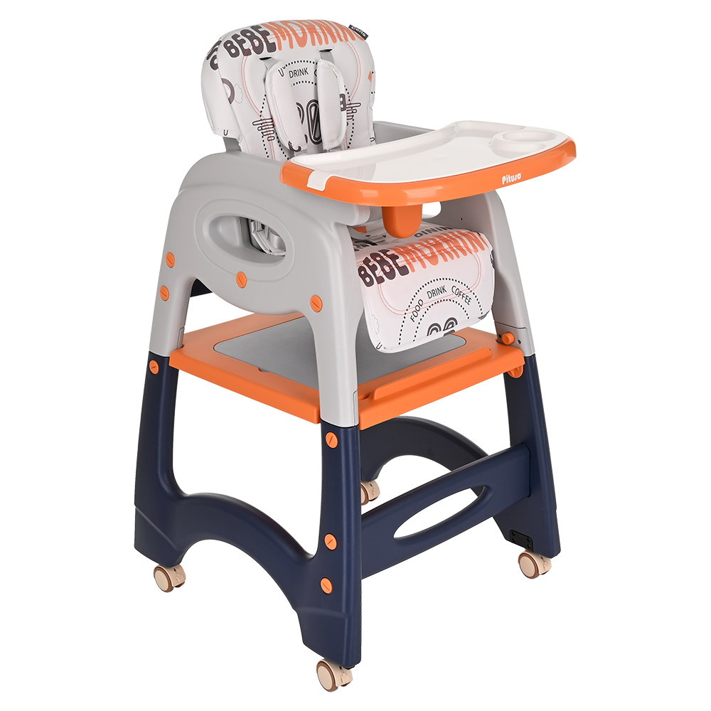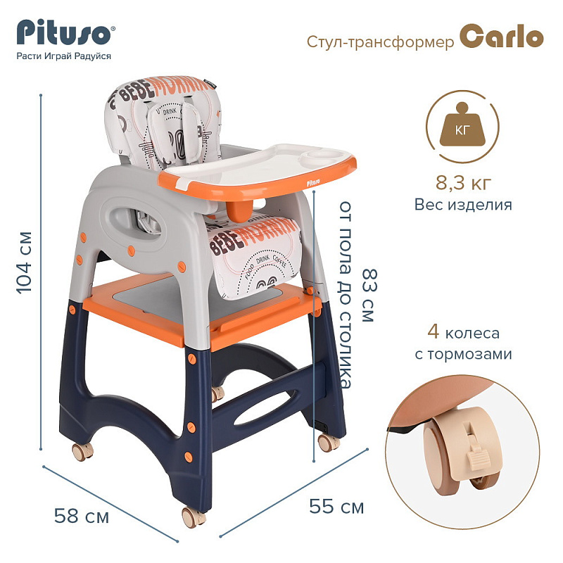 Стул-трансформер Pituso Carlo обновленная модель 2023 года представляет собой идеальную конструкцию 2 в 1. В собранном виде может быть высоким стульчиком для кормления со съемным регулируемым столиком и 5-точечными страховочными ремнями безопасности. Спинка стула регулируется, что позволяет ребенку вздремнуть после сытной трапезы. Эта модель удобная и маневренная засчет 4 колес, которые надежно фиксируются засчет стоперов на каждом колесе. Трансформируется в отдельную комбинацию – стол + стул, за которым Вашему малышу будет интересно играть и заниматься творчеством.