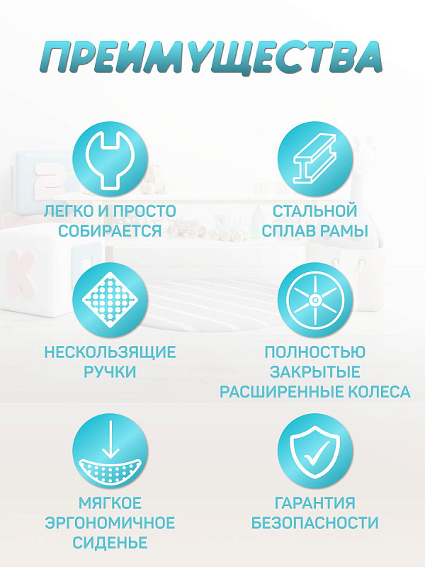 Полностью закрытые широкие колеса уберегут малыша от падения даже при резких поворотах.