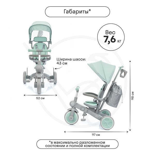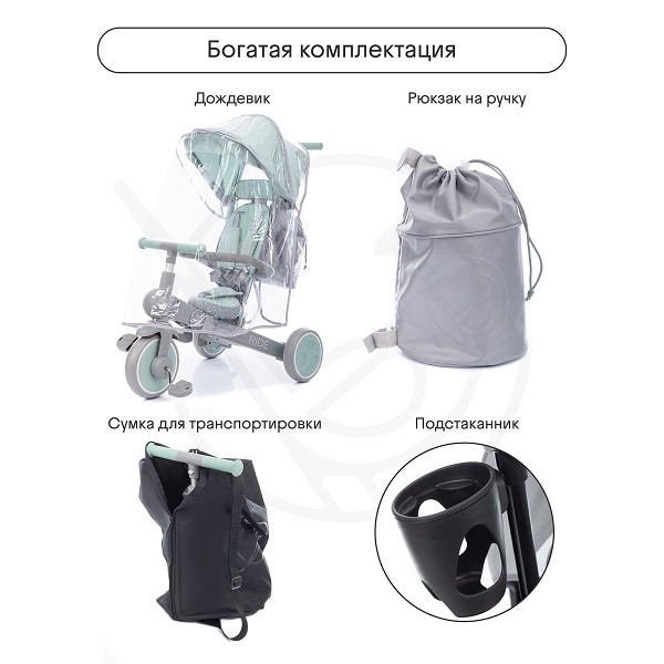 - В комплекте с велосипедом идут дождевик, держатель для бутылочки, сумка на родительскую ручку и сумка для хранения.