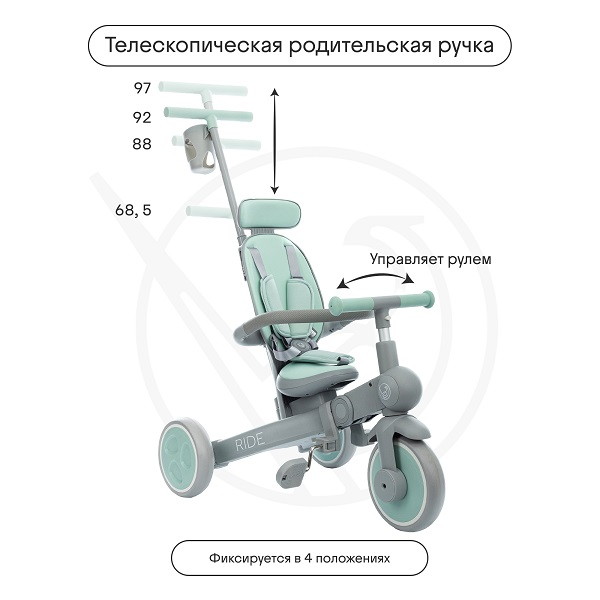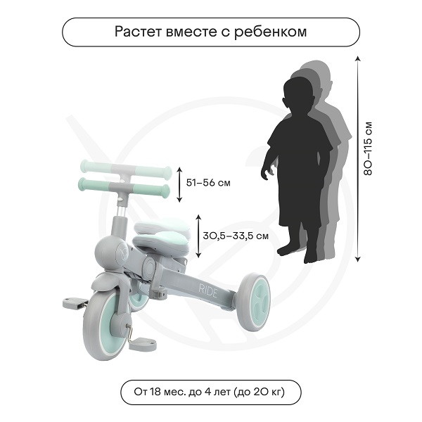 - Ride идеально подходит для детей от 18 месяцев до 4 лет (до 20 кг), что делает его отличным выбором на долгие годы. В начале, когда ваш малыш еще маленький, его будут катать родители, обеспечивая комфортное и безопасное катание. По мере роста ребенка родительская ручка легко убирается, и малыш получает возможность управлять велосипедом самостоятельно, открывая для себя мир приключений!