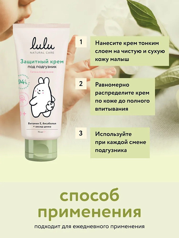 Крем под подгузник подходит для детей с первых дней жизни и более взрослого возраста, крем от опрелостей для новорожденных LuLu полностью гипоаллергенный и не вызывает аллергических реакций. Наш крем для новорожденных дерматологически протестирован и одобрен. Крем для интимной зоны малыша от LuLu не содержит минерального масла, силиконов и парабенов.