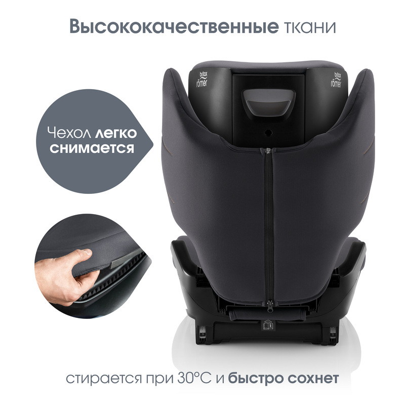 - Иногда в автомобиле бывает не очень чисто — может пролиться жидкость или рассыпаться еда. Поэтому в Britax Roemer разработали чехол из высококачественных тканей, который можно легко снять и постирать в стиральной машине.