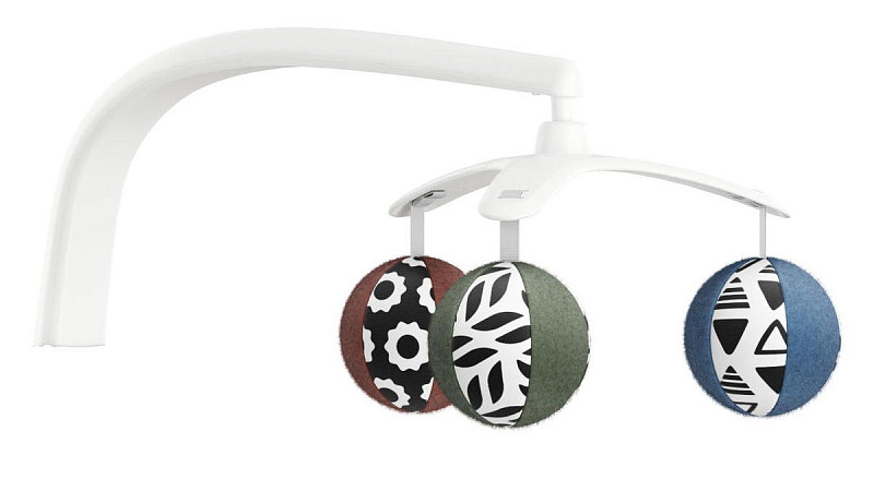 Занимательный мобиль с игрушками-шариками, выполненными в цветах и узорах, способствует развитию малыша.