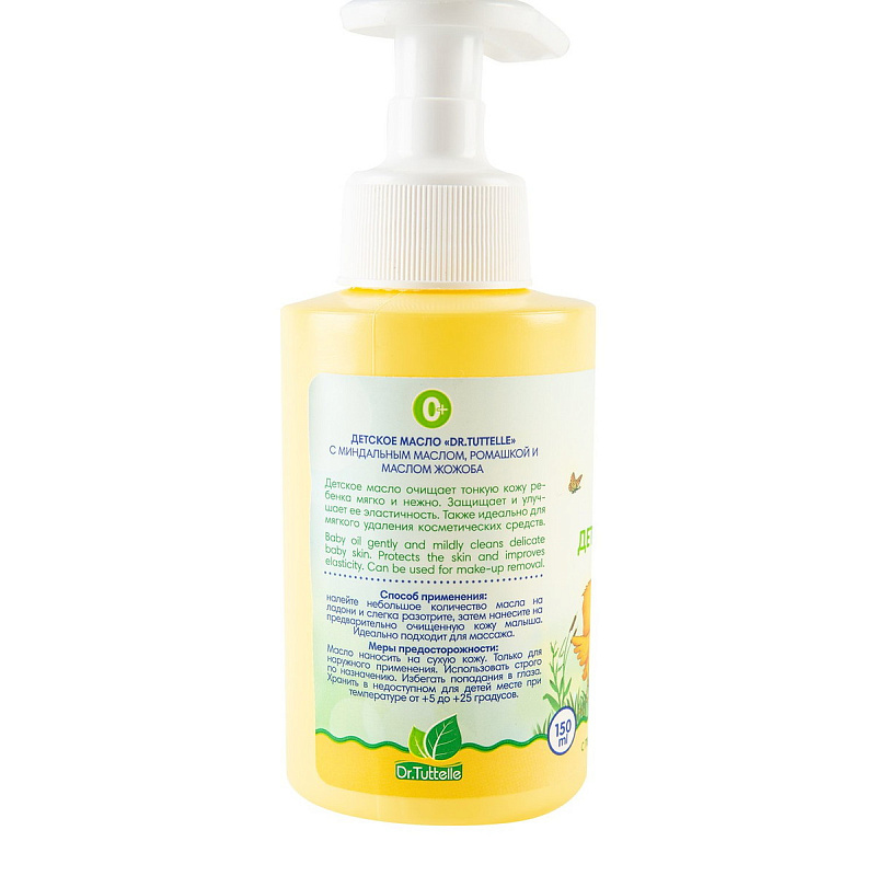Детское масло Dr.Tuttelle без красителей и отдушек, с первых дней жизни 0+, с миндальным маслом, ромашкой, маслом жожоба очищает тонкую кожу ребенка мягко и нежно. Защищает кожу и улучшает ее эластичность. Так же идеально для мягкого удаления косметики.