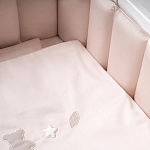 Специально к этому комплекту мы разработали бортики со съемными чехлами на молнии из двух частей: первая состоит из 6-ти подушечек, вторая - из 12-ти. Сочетание натурального хлопкового сатина и воздушного гипоаллергенного наполнителя Холлкон обеспечивает еще одно полезное свойство: подушечки хорошо пропускают воздух и поддерживают температурный баланс.