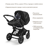 - для прогулочных колясок продуман таким образом, что натягивается на подножку, но при этом оставляет достаточно места для зимнего конверта или муфты;