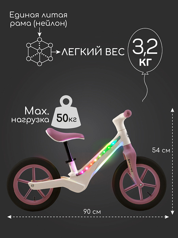 На руле у детского беговела также предусмотрен фонарик. Благодаря надувным колесам велобег обеспечивает плавный ход, а ударопрочная нейлоновая рама гарантирует долговечность и безопасность. Противоскользящие грипсы для надежного хвата. Удобные выемки-подножки для ног для максимального комфорта. Эргономичное седло из эко-кожи, которое всегда останется комфортным. Сиденье регулируется по высоте, подстраиваясь под стремительный рост вашего ребенка. Максимальная нагрузка 50 кг.