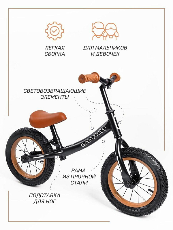 Беговел детский Amarobaby ROAD RACER (может быть известен Вам как: шаговел, велобег, ранбайк, велокат) для малышей старше 3 лет поддерживает всестороннее развитие вашего ребенка, обеспечивая ему долгие часы веселья на свежем воздухе, станет любимым развлечением для ребенка, с пользой для его здоровья и развития. Беговел - это детский велосипед без педалей, который научит ребенка держать равновесие и укрепит ножки и ручки, что в дальнейшем поможет освоить двухколесный велосипед без опорных колес, подойдёт как для девочек, так и для мальчиков. Простая и надёжная конструкция изделия гарантирует комфорт и безопасность ребёнка во время езды. Наш лёгкий беговел имеет раму из стали с максимальной нагрузкой до 30 кг. Надувные колеса размером 12" обеспечат комфортную поездку и хорошую проходимость. Эргономичное сидение позволит ребенку сидеть комфортно продолжительное время.