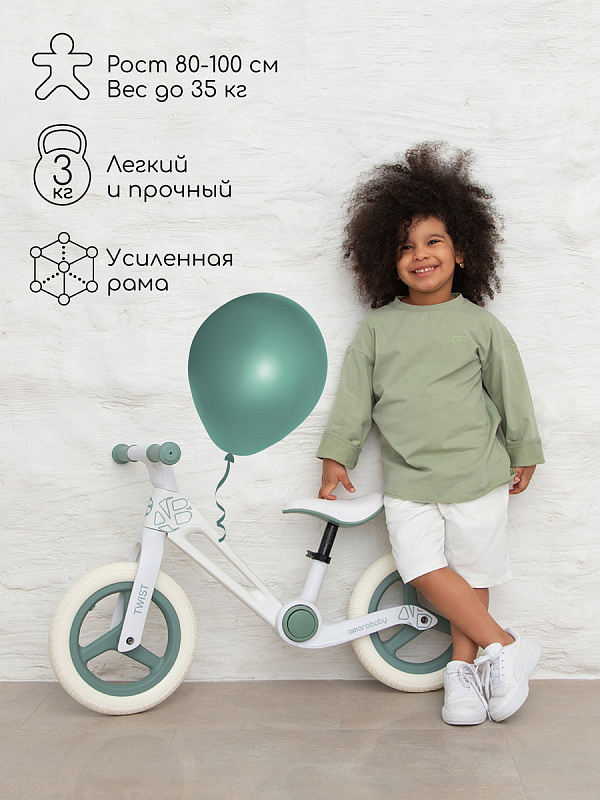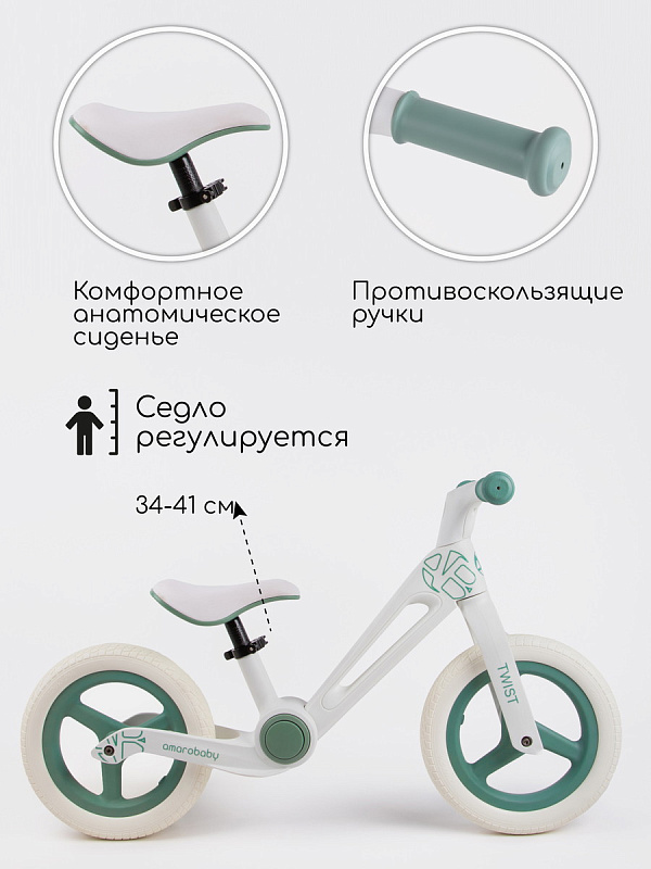 Беговел складной AmaroBaby Twist - для ярких и незабываемых прогулок вашего ребенка. Подходит для детей ростом от 80 до 100 см и весом до 35 кг. Анатомическое сиденье с регулировкой по высоте гарантирует дополнительный комфорт, особенно при длительных поездках.