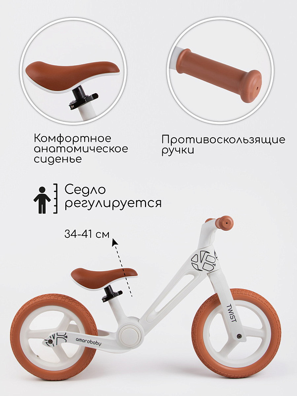 Беговел складной AmaroBaby Twist - для ярких и незабываемых прогулок вашего ребенка. Подходит для детей ростом от 80 до 100 см и весом до 35 кг. Анатомическое сиденье с регулировкой по высоте гарантирует дополнительный комфорт, особенно при длительных поездках.