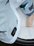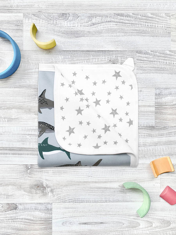 Двусторонний плед Mjölk [мьёльк] Акулы выполнен из двух слоёв трикотажного 100% хлопка без наполнителя. Материал нежный и мягкий, дышит, не вызывает аллергии и дарит ребёнку уют. Плед можно использовать для сна в кроватке, коляске и автокресле, как накидку для кормления. Яркий принт делает его отличным фоном для фотосессий в домашних условиях или на улице. Изделие хорошо сочетается с шапочками, комбинезонами и пелёнками в тон.
