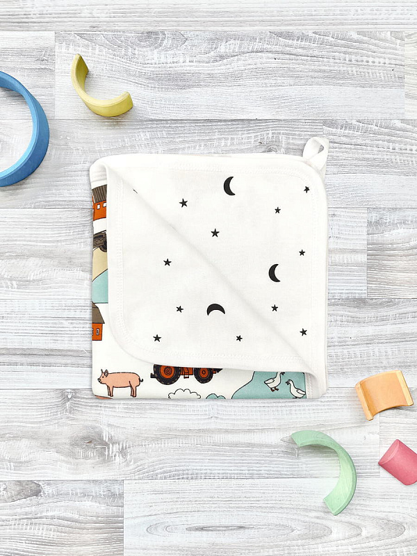 Плед изготовлен из трикотажного хлопка под названием интерлок. Интерлок – это плотный трикотаж двойного плетения хлопчатобумажных нитей. Изделия из такого материала практически не мнутся, хорошо сохраняют цвет и форму. Принт с милыми поросятами, овечками, коровами и гусями подойдёт мальчикам и девочкам. Плюсы материала: