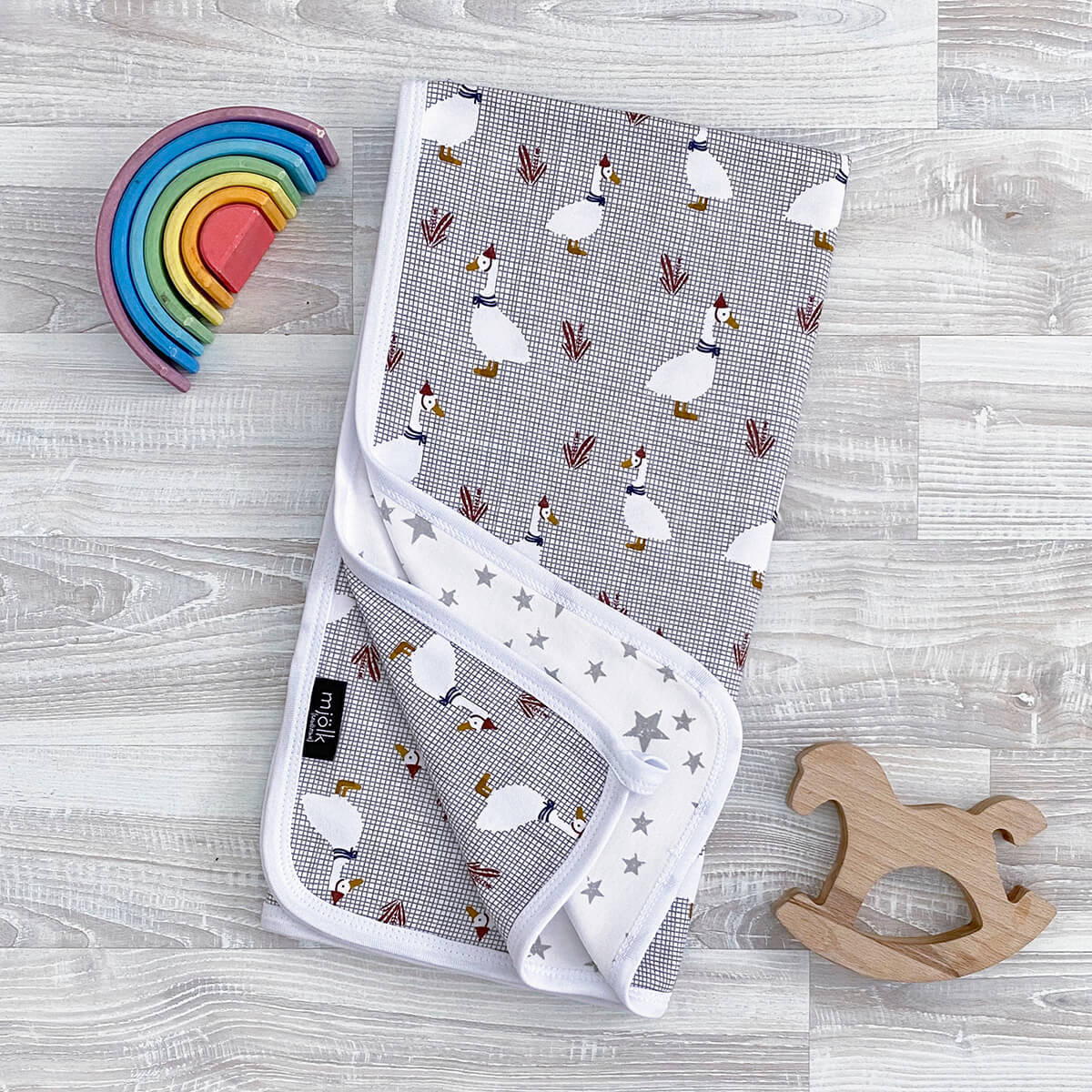 Двусторонний плед Mjölk [мьёльк] Гуси выполнен из двух слоёв трикотажного 100% хлопка без наполнителя. С одной стороны рисунок белых гусей, с другой стороны милые звездочки. Материал нежный и мягкий, «дышит», не вызывает аллергии и дарит ребёнку уют. Плед можно использовать для сна в кроватке, коляске и автокресле, как накидку для кормления. Яркий принт делает его отличным фоном для фотосессий в домашних условиях или на улице.