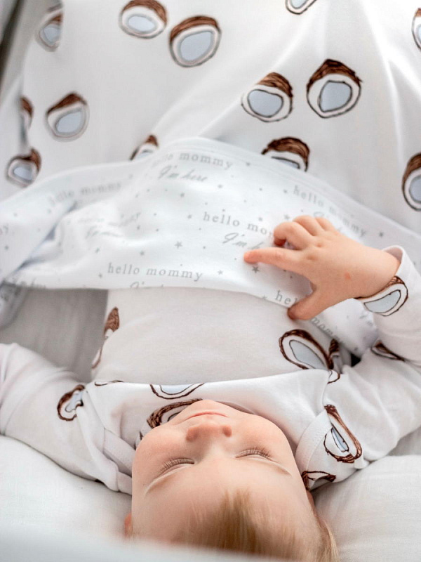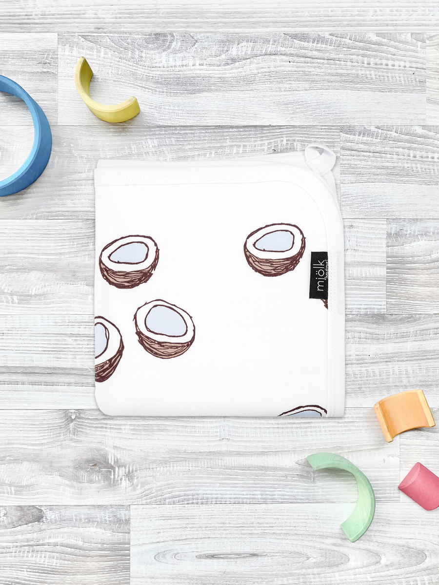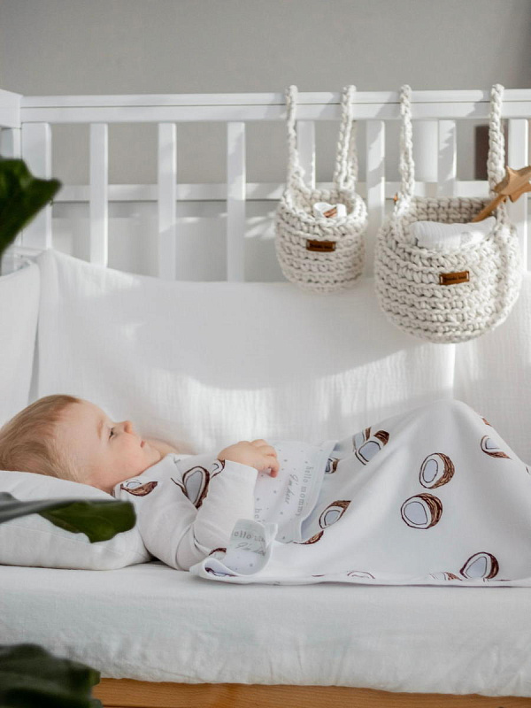 Двусторонний плед Mjölk [мьёльк] Кокосы выполнен из двух слоёв трикотажного 100% хлопка без наполнителя. Одну сторону пледа украшает рисунок из половинок аппетитных кокосов на белом фоне. Материал нежный и мягкий, «дышит», не вызывает аллергии и дарит ребёнку уют. Плед можно использовать для сна в кроватке, коляске и автокресле, как накидку для кормления. Яркий принт делает его отличным фоном для фотосессий в домашних условиях или на улице.