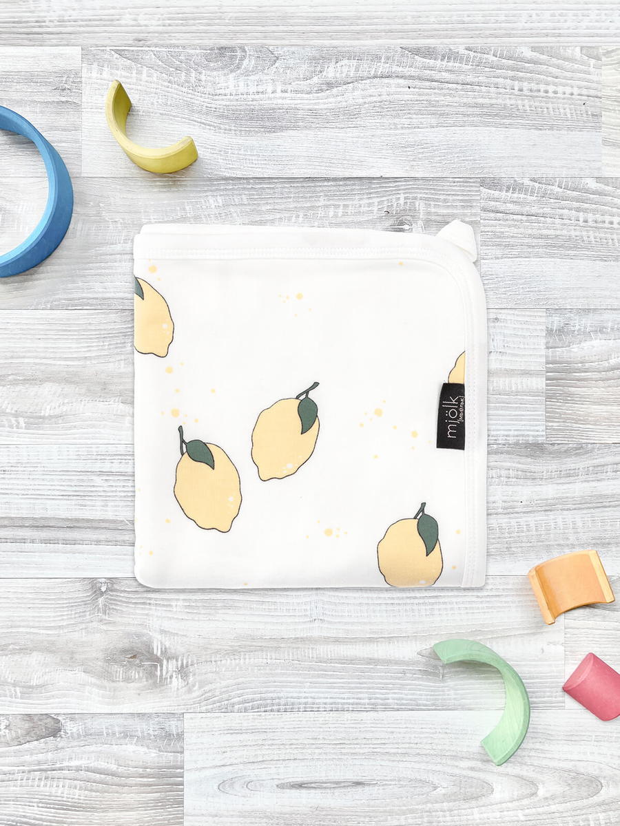 Двусторонний плед Mjölk [мьёльк] Лимоны выполнен из двух слоёв трикотажного 100% хлопка без наполнителя. С одной стороны жёлтые лимончики на белом фоне, с другой стороны молочный цвет экрю. Материал нежный и мягкий, «дышит», не вызывает аллергии и дарит ребёнку уют. Плед можно использовать для сна в кроватке, коляске и автокресле, как накидку для кормления. Яркий принт делает его отличным фоном для фотосессий в домашних условиях или на улице.