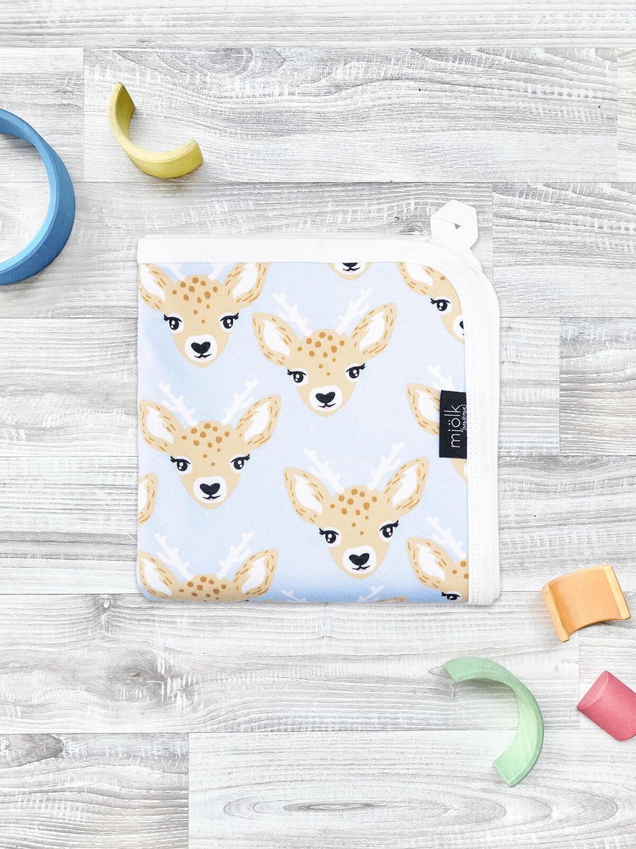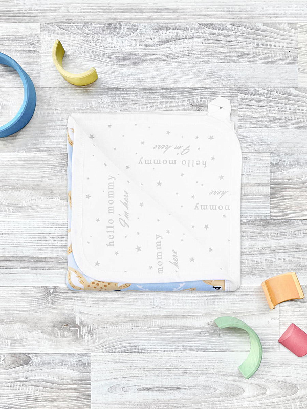 Двусторонний плед Mjölk [мьёльк] Оленята NEW выполнен из двух слоёв трикотажного 100% хлопка без наполнителя. Одну сторону пледа украшает рисунок из милых оленей на голубом фоне, а на второй стороне расположились нежные строки "Hello Mommy, I'm here", что в переводе с английского означает "Привет, мамочка. Я здесь". Материал нежный и мягкий, «дышит», не вызывает аллергии и дарит ребёнку уют. Плед можно использовать для сна в кроватке, коляске и автокресле, как накидку для кормления. Яркий принт делает его отличным фоном для фотосессий в домашних условиях или на улице.