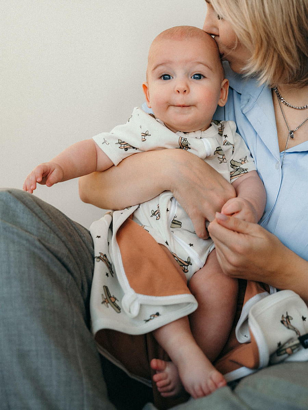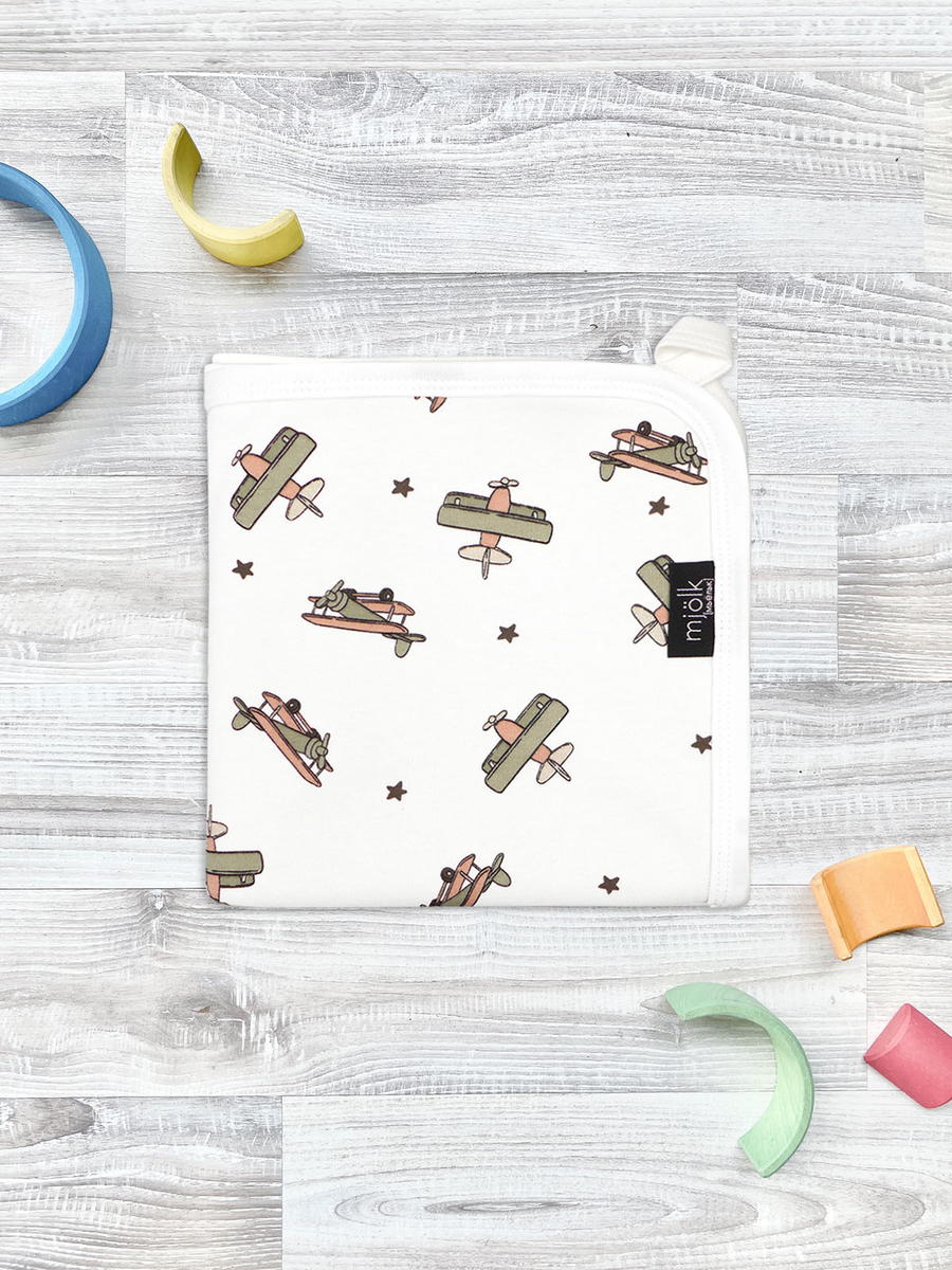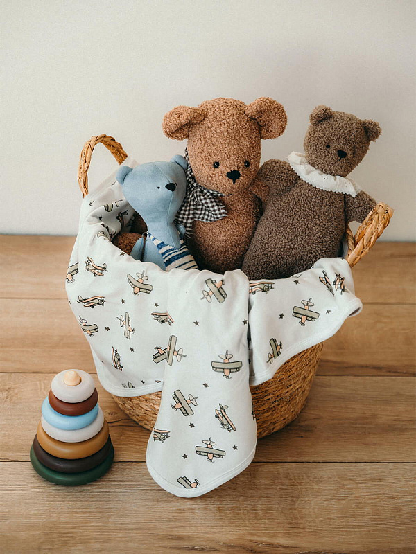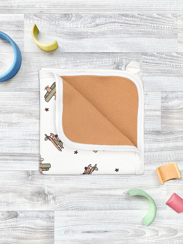 Двусторонний плед Mjölk [мьёльк] Самолёты выполнен из двух слоёв трикотажного 100% хлопка без наполнителя. Материал нежный и мягкий, дышит, не вызывает аллергии и дарит ребёнку уют. Плед можно использовать для сна в кроватке, коляске и автокресле, как накидку для кормления. Яркий принт делает его отличным фоном для фотосессий в домашних условиях или на улице. Изделие хорошо сочетается с шапочками, комбинезонами и пелёнками в тон.